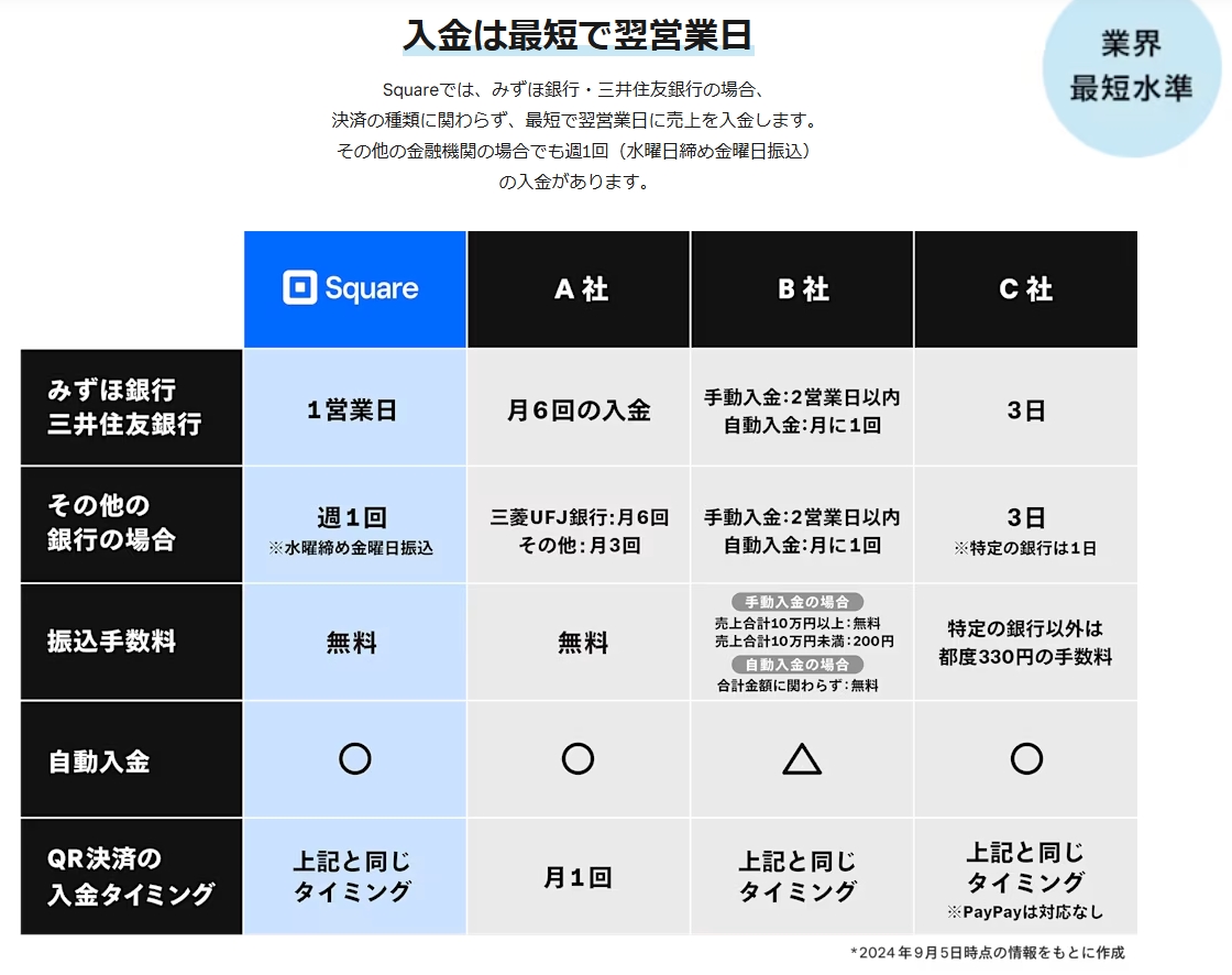 通常、キャッシュレス決済の入金サイクルは2日〜1週間が一般的ですが、Squareなら最短で翌日入金。週末や祝日も含めて毎日入金されるため、資金繰りに悩む小規模事業者にとっては非常に心強いポイントです。